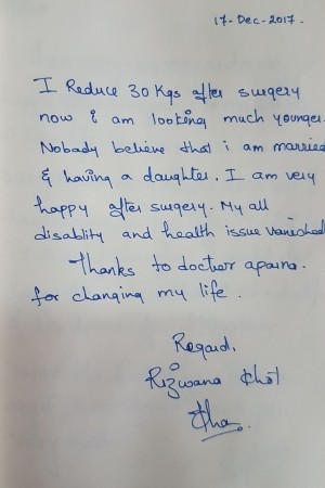 Rizwana Khot, a 30 years old lady underwent a laparoscopic Roux en-y gastric bypass surgery in 2017. She lost 30 kg and has come down from a weight of 92 kg to 60 Kg. She is extremely happy and healthy now.